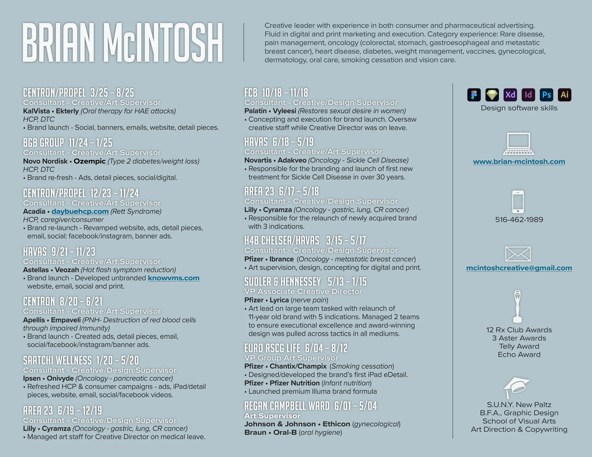 NYC based, detail oriented art director and creative leader, who has handled complex and lengthy digital and print projects for agencies such as: Area 23, Saatchi Wellness, FCB, Propel Health and Havas. Upon multiple agencies’ satisfaction with my work, I have been requested to return for additional projects.